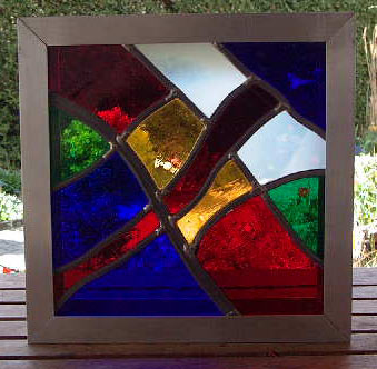 Bleiverglasung aus Echtantikglas in einen Alurahmen eingesetzt.
